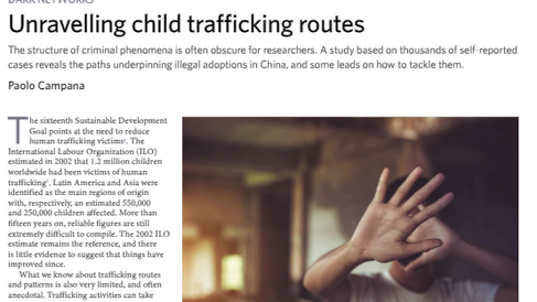 Dr Paolo Campana has just published a News & Views piece on child-trafficking routes in Nature Sustainability. The article is based on a ground-breaking study by Zhen Wang and colleagues, who applied a network approach to study child trafficking for the purpose of illegal adoption in China. The research is based on a dataset of self-reported cases collected by a Chinese NGO, Baby Coming Back Home. The authors analysed the trafficking path of 22,531 provincial-level and 22,139 city-level cases from September 1927 to August 2017. You can read the full article here.