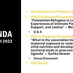 Menaal provided an interesting insight into issues around conducting qualitative interviews on Palestinian refugees in Lebanon and their experiences of intimate partner violence, support and justice. This was followed by a work-in-progress presentation by Sarika, who recently completed her fieldwork in northern Uganda to explore the impact of maternal exposure to violence on early child nutrition and development.